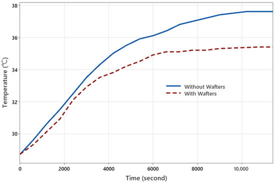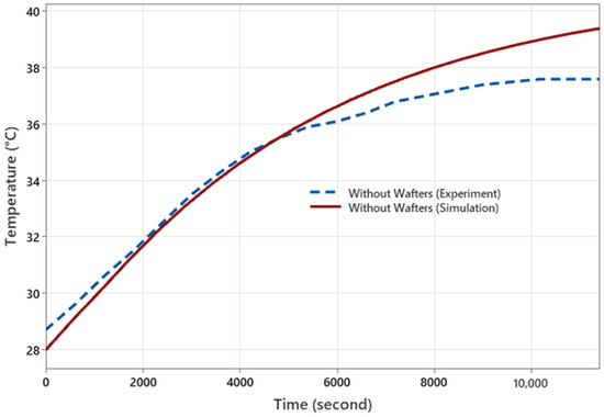 Figure 9 compares the heat rise of the IWM endcap without wafters between the simulation and experimental tests under no-load conditions. The p-value from the two-sample t-test is 0.656, indicating that is accepted because the p-value is more significant than α. is accepted, which means that the temperature in the IWM housing without wafters is the same in both the simulated and the experimental tests. The difference between the experimental test results and the simulation on the IWM without wafers is 1.3%.