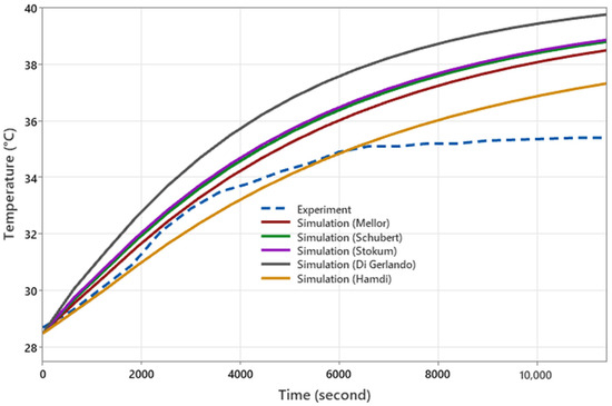 Figure 10 shows the heat rise of the IWM endcap with wafters between the experimental testing and simulations under no-load conditions. Of the five simulation tests, visually, the simulation (Hamdi) showed results that were closest to the experimental test results. A two-sample t-test statistical test was conducted between the experimental and simulation test results. The p-value of the experimental test with simulation by Hamdi [34] is 0.527, the p-value of the experimental test with simulation by Mellor [35] is 0.105, the p-value of the experimental test with simulation by Schubert [36] is 0.057, and the p-value of the experimental test with simulation by Stokum [37] is 0.047. The p-value of the experimental test with simulation by Di Gerlando [38] is 0.007. Based on the statistical test, the simulations by Hamdi [34], Mellor [35], and Schubert [36] have a p-value that is greater than the alpha value, namely 0.05, so is accepted, which means there is no difference between the simulation results and the experimental test results. The one that has a more remarkable similarity to the experimental test results is the simulation by Hamdi because it has a more significant p-value. The p-values of the simulations by Stokum and Di Gerlando are smaller than the alpha value, so is rejected, and is accepted, so there is a difference between the results of the experimental test and the simulation results for the IWM equipped with wafters. From the results of the visual observations and statistical tests, it can be concluded that the convection coefficient from the research conducted by Hamdi is similar to the convection coefficient from the use of wafers in this study, so for the following analysis, the end-space cooling correlations data from Hamdi will be used, as shown in Table 4. The error between the experimental test and the simulation (Hamdi) was only 1.56%, an acceptable error value.