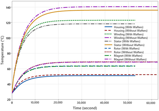 Figure 11 illustrates the thermal properties of crucial components of the IWM, specifically the windings, stator, rotor, magnets, and housing, utilizing wafters at an output power of 1.5 kW and a torque of 15 Nm. The data were acquired from a simulated test. To achieve a power output of 1.5 kW, a peak current of 24.94 A (amperes) and a DC bus voltage of 70 V (volts) are required. The RMS current is 17.64 V, the RMS current density is 2.344 V, and the winding connection is a star connection. The graphic indicates that the winding of the IWM component reaches the highest temperature. The stator temperature exceeds that of the rotor, whereas the rotor and permanent magnet temperatures are nearly identical, with the housing exhibiting the lowest temperature. The temperature of the IWM components utilizing wafters is lower. The temperature of the in-wheel motor components with wafters attains a steady state more rapidly than that of the IWM components without wafters. The IWM with wafters attains a steady temperature in 53,010 s (883.1 min), but the IWM without wafters stabilizes at 62,700 s (1045 min). The stable temperature of the IWM components with wafters is achieved 162 min faster than the IWM without wafters. Table 5 shows the temperature drop in the IWM components due to wafters application.