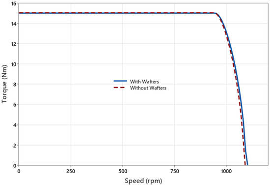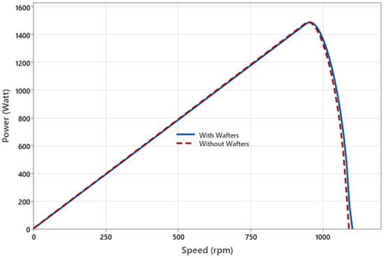 Figure 12 illustrates torque versus speed for an IWM both with and without wafters, whereas Figure 13 depicts power versus speed for an IWM under the same conditions. Applying wafers to the IWM marginally enhances the torque generated by the IWM, while the increase is not substantial. The mean torque generated by the IWM without wafters is 14.23 Nm, whereas the mean torque generated by the IWM with wafters is 14.25 Nm. Applying wafters to the IWM enhances the torque generated by the IWM by 0.14%. The average power generated by the IWM without wafers is 775.3 watts, whereas the average power generated by the IWM with wafters is 780.3 watts. Applying wafters to the IWM enhances its power output by 0.64%.