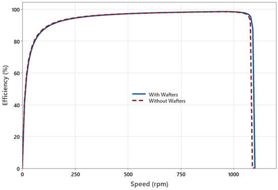 Figure 14 plots the efficiency of an IWM with and without wafters against the rotating speed. The IWM’s efficiency with wafters differs from that without wafters, but the difference is minor. The average efficiency of an IWM with wafters is 92.6%, whereas that of an IWM without wafters is 92.1%. Applying wafters to the IWM improves the machine’s efficiency by 0.6%.
