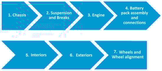 The supply chain and manufacturing process of the battery packs used in electric vehicles is complex and consists of many different stages. One important part is, however, the assembly of the battery pack. The inputs to this process are individual battery cells, units used to form modules, connections, and some other components. The output of this process is battery packs ready to be mounted in an electric vehicle. The process varies depending on the types of cells used and the design of the pack. However, the process generally consists of the following steps: First, individual cells are assembled into battery modules. Second, modules are assembled into a battery pack. Third, adding components, connections, and covering the battery pack. After this, the battery pack is tested and validated before being mounted into the vehicle [20,21].