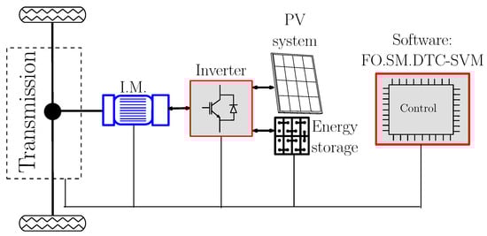 Figure 1 depicts a simplified representation of an electric vehicle propulsion system, highlighting the key components involved in transforming electrical energy into mechanical motion for vehicle propulsion. The control system functions as the brain of the system, regulating the motor’s speed and torque in response to driver inputs and vehicle conditions. It employs a sophisticated FO-SM control strategy to ensure precise and efficient operation. The transmission connects the motor to the wheels, typically incorporating a gearbox to adjust the motor’s output speed and torque to match the vehicle’s requirements. The induction motor (I.M.) is the electrical motor that transforms electrical energy into mechanical energy to propel the vehicle. The inverter, an electronic device, converts the DC power from the battery or PV system into AC power suitable for driving the induction motor. The optional PV system can provide supplemental power from solar energy, contributing to the vehicle’s overall efficiency. The software represents the control algorithms and logic implemented in the control system. The FO-SM-DTC-SVM strategy is specifically mentioned, indicating a combination of advanced control techniques. The control system receives inputs from the driver (e.g., accelerator pedal) and sensors (e.g., speed sensor). Based on these inputs, it calculates the desired speed and torque for the motor. The control system then sends signals to the inverter, which adjusts the voltage and frequency of the AC power supplied to the motor. The motor generates the required torque, which is transmitted to the wheels through the transmission, propelling the vehicle. The PV system, if present, can contribute to the overall power supply, increasing efficiency.