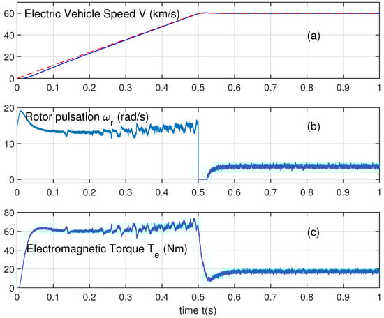 (a) Continued line: electric vehicle speed. Dashed line: its desired trajectory. (b) Rotor pulsation. (c) Electromagnetic torque.