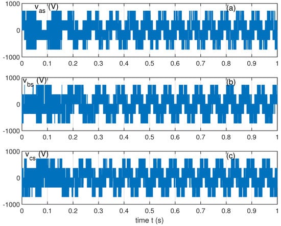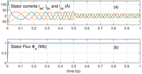 Figure 4a displays the temporal evolution of the stator currents , , and . They have adequate variations as sinusoidal shapes during steady state in the time interval [0.6, 1] s. They present low total harmonic distortions: