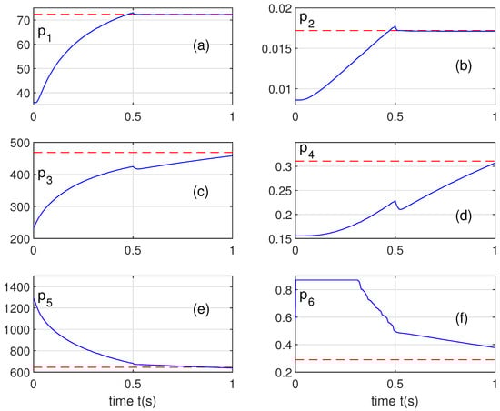 Figure 7 represents the evolution of the six parameters , . These parameters converge to their actual values.