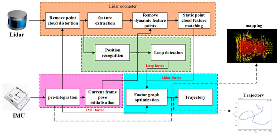 This paper employs a tightly coupled LiDAR and IMU framework [10], which is primarily composed of an IMU pre-integration module, a LiDAR odometry module, a loop detection module, and a graph optimization module. Initially, IMU pre-integration is utilized to alleviate point cloud distortion, and the current frame’s pose is initialized through the IMU pre-integration process. Within the LiDAR odometry segment, curvature computation is performed to extract line and surface features from the point cloud data. Subsequently, the unstable dynamic point cloud within the dataset is filtered out, and static feature points are matched to compute the relative pose between the current frame and sub-images. Finally, the IMU pre-integration factor, LiDAR odometry factor, and loop closure factor are integrated into the factor graph optimization model. The Gauss–Newton method is employed to optimize the poses of each node as well as the IMU accelerometer bias and gyroscope bias. This process ultimately generates a globally consistent point cloud map. The overall system framework is illustrated in Figure 1.