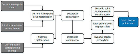 To address the aforementioned challenges, current methodologies for dynamic object filtering can be broadly categorized into two main approaches: deep learning-based semantic segmentation techniques, and traditional methods. Firstly, leveraging deep learning’s semantic segmentation capabilities, the method identifies dynamic objects based on the semantic categories derived from point-cloud clustering and subsequently removes them. Milioto et al. [4] conducted comprehensive semantic segmentation of LiDAR point clouds using deep learning-based techniques [5] and employed the convolutional neural network (CNN) of the LiDAR sensor model to discern dynamic objects. This approach is capable of real-time execution on a single embedded GPU (graphics processing unit). In a similar vein, Fang J. et al. [6] utilized object detection (specifically YOLO v. 4) to obtain the bounding boxes of dynamic objects. Subsequently, they segmented the foreground within these bounding boxes by employing depth images and the maximum inter-class variance algorithm, subsequently eliminating the dynamic feature points within the foreground to achieve pixel-level precision. Deep learning-based methods can indeed meet the system’s real-time requirements; however, they are contingent upon a substantial number of monitoring tags and extensive training data, demanding considerable computational resources. This dependency on data and computational power underscores the necessity for alternative methods that might balance precision with resource efficiency.