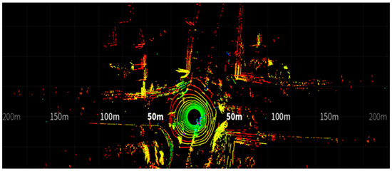 Lidar senses the environment by emitting and receiving laser beams, utilizing time-of-flight ranging. After completing a scan, LiDAR acquires information about the surrounding environment. However, due to the characteristics of LiDAR, the point cloud density decreases as the distance increases, as shown in Figure 4. To preserve as many effective points as possible and reduce the influence of random noise, this study employs a pass-through filtering method. This method filters out point clouds beyond a radius of 80 m from the center of the LiDAR, defining the effective sensing area radius as L max = 80   m .