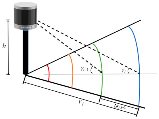 As depicted in Figure 5, given the height of the lidar above the ground is h, the angle between the i-th laser transmitter and the ground plane is γ i , and the angle between the (i + 1)-th laser transmitter and the ground plane is γ i + 1 . Assuming the laser transmitter at the top of the lidar is labeled as number 1 and increments sequentially from top to bottom, the radial spacing Δ r i , i + 1 between the concentric circles formed by the i-th and (i + 1)-th laser transmitters at the same instance can be calculated using Equation (11).