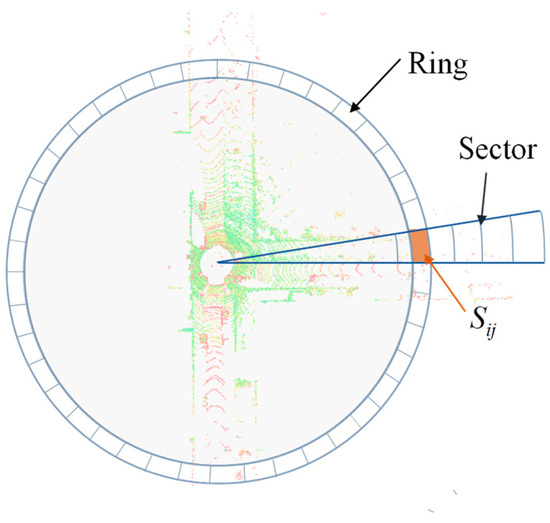 The distance Δ r i , i + 1 formed by concentric circles on the ground plane is used as the distance between rings, with the spacing l n determined as shown in Equation (12). This method ensures a more uniform distribution of point cloud data within each grid area. Figure 6 illustrates an example of the point cloud grid partitioning scheme.