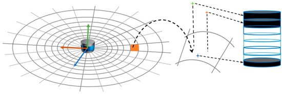 There are n laser points in a scan of the lidar, which can be represented by P = { p 1 , p 2 p n } . Each laser point can be represented as p k = { x k , y k , z k , η k } in the local Cartesian coordinate system, where η represents the intensity reading and ( x , y , z ) is the geometric reading. First, convert each point on the x-y plane into polar coordinates to obtain the coordinate form shown in Equation (10).