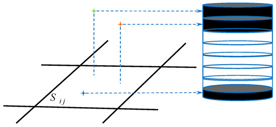 Subsequently, the point clouds falling within the same grid are encoded as illustrated in Figure 8. Initially, each grid is linearly divided according to the height range, evenly split into eight subspaces, each denoted by z k , where k [ 1 , 8 ] . Each point cloud within the grid is assigned to the corresponding subspace based on its height value. If a subspace contains point clouds, it is set to 1; otherwise, it is set to 0. This process generates an 8-bit binary code for each grid, which is then converted into a decimal number between 0 and 255 to complete the linear discretization of the height descriptor. The encoding descriptor corresponding to each grid S i j is represented by η i j .