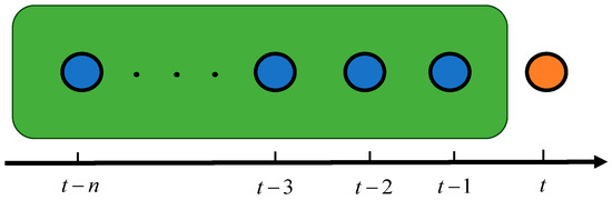 Subsequently, the grid descriptor construction is performed between the current frame point cloud P k and the submap P k M corresponding to the current frame point cloud. Here, the submap associated with the current frame is a local submap constructed from historical frames prior to the current frame, with the corresponding relationship illustrated in Figure 9. Additionally, this submap is updated in a sliding window fashion. The orange circle denotes the current keyframe, the blue circle represents the historical keyframes, and the green box indicates the local submap [24].