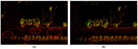 Figure 14. (a) Comparison chart of dynamic obstacle removal effects using the ERASOR algorithm; (b) comparison chart of dynamic obstacle removal effects using the algorithm in this paper.