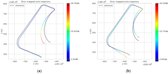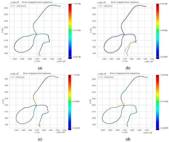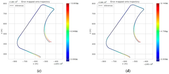 Figure 18. (a) ALOAM algorithm’s trajectory error chart for the street02 sequence; (b) LeGO-LOAM algorithm’s trajectory error chart for the street02 sequence; (c) LIO-SAM algorithm’s trajectory error chart for the street02 sequence; (d) our algorithm’s trajectory error chart for the street02 sequence.