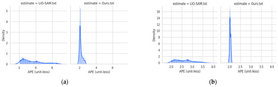 Figure 21. (a) Distribution chart of ATE in different ranges for experiment scene one on campus; (b) distribution chart of ATE in different ranges for experiment scene two on campus.