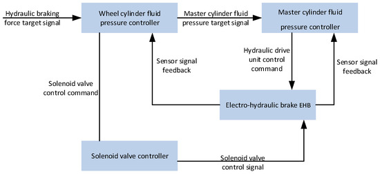 Hydraulic pressure control is a fundamental function of the electronic hydraulic braking system. The hydraulic pressure control in this system is categorized into master cylinder hydraulic pressure control and wheel cylinder hydraulic pressure control. The wheel cylinder hydraulic pressure control is further divided into upper-level control of wheel cylinder hydraulic pressure and lower-level control of the solenoid valve. The former is used to calculate the control commands for the solenoid valve, while the latter determines the control methods for the solenoid valve. The hydraulic pressure control architecture of the EHB is illustrated in Figure 4.