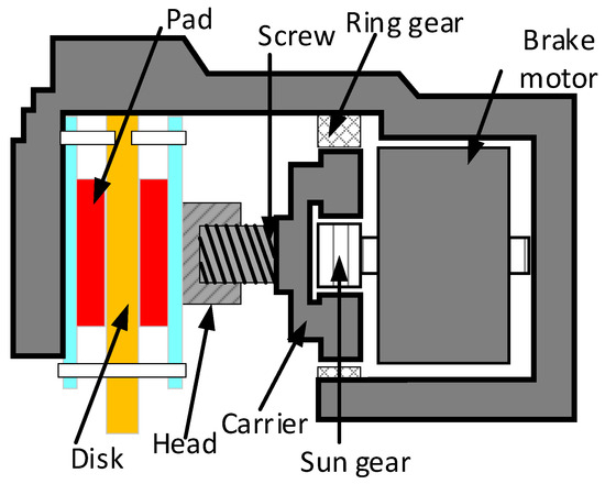 The EMB primarily consists of a pedal module (sensors), a control module (ECU), and a driving executive module (electromechanical brake). The system includes four independent brake systems located at the wheel cylinders of each of the four hubs, each equipped with independent controllers to enable independent adjustment of the braking force for each wheel. In the EMB, all hydraulic components (including the master cylinder, hydraulic lines, and auxiliary devices) are replaced by an electromechanical system, and the regulators for hydraulic disk and drum brakes are also replaced by motor-driven devices. A typical EMB is illustrated in Figure 5 [68,69]. Figure 5 illustrates the structure of EMB. The system comprises a brake motor that drives the screw, which in turn actuates the carrier and head to press the brake pads against the disk. The ring gear and sun gear facilitate the transmission of mechanical force, ensuring precise and reliable braking performance.