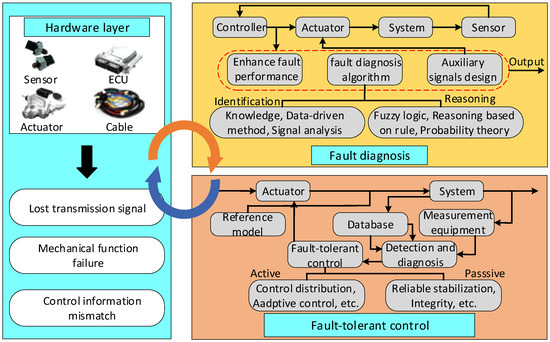 The LSV-BBW system achieves high-precision braking through the use of a controller and electromagnetic actuators. However, prolonged use can lead to component aging and failures, potentially resulting in safety incidents. Despite the implementation of redundancy designs to enhance stability and safety, the LSV-BBW system demands extremely high reliability. Future efforts should focus on strengthening research on redundancy technologies and improving fault diagnosis and tolerance techniques to ensure the application and reliability of the BBW system [110,111,112,113,114]. Effective fault diagnosis and fault tolerant control are a method to solve the brake fault, and the characteristics and solutions of the brake fault are shown in Figure 6. Figure 6 illustrates the fault characteristics and solution of BBW. The hardware layer includes sensors, an ECU, actuators, and cables, which can experience issues such as lost transmission signals, mechanical function failures, and control information mismatches. The fault diagnosis process employs knowledge-based and data-driven methods, signal analysis, fuzzy logic, and reasoning based on rules and probability theory. The fault-tolerant control mechanisms include active strategies such as control distribution and adaptive control, as well as passive strategies such as reliable stabilization and integrity checks, to ensure system reliability and safety.
