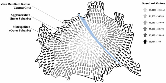 Ultimately, the vector (β parameter) signifies the likely movement direction for the population at a specific point. The shape of the attraction and repulsion functions, determined individually, intersect at the “zero-resultant radius”. Aggregating these vectors forms sectors where the forces converge toward a central point. Mapping involves the central city’s center as a null resultant convergence point for the attractive and repulsive forces. The zero-resultant radius is a demarcation line, indicating a balance of forces. This methodology aids in mapping central city, agglomeration, and metropolitan area boundaries, as demonstrated in Figure 1 [68].