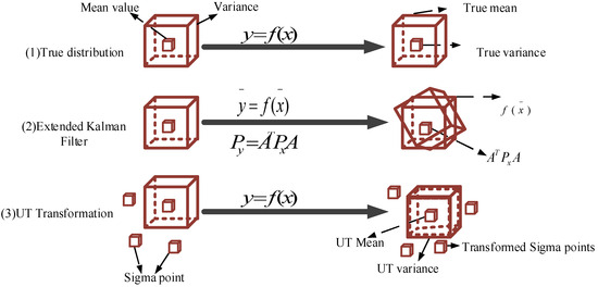 In Figure 2, the central idea of the traceless transformation is that the calculation process should prioritize ensuring that the sampling mean and covariance are and , respectively. This set of sampling points is transformed nonlinearly for each sigma point to obtain the point sets and , and the predetermined system is [21,22]. The dimension of the state matrix is shown in Equation (7).