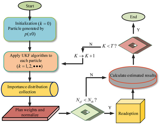 The method of using the UKF for generating the importance distribution of PF is called UPF [23,24]. It establishes a mathematical model of the internal state of the packs, including the packs’ voltage, temperature, charging current, etc. Then, experimental measurements are conducted to measure the discharge curve data of the packs under different states, which are input into the UPF filter for training and validation. The UPF combines the accuracy of the Kalman filter and the wide area of particle filter to optimize the handling of nonlinear and non-Gaussian problems. This is particularly applicable to the valuation of the ternary LPA SOC. The algorithm flowchart for estimating the SOC state of the ternary LPA using UPF is showcased in Figure 4.