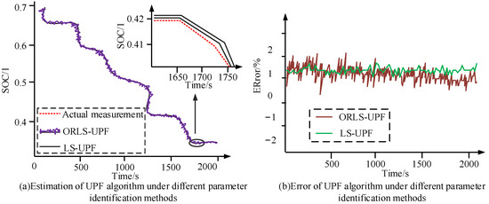 To verify the superiority of the UPF algorithm in estimating the SOC performance of the LPA, intermittent discharge tests were conducted on a 3.7 V/3.2 Ah LPA produced by Panasonic. It recorded real-time data, such as the voltage and current of the ternary LPA at room temperature (25 °C), and the relevant data were utilized as the simulation input. The simulation design set the initial SOC value of the ternary LPA to 0.7 and the particle number to 200, and the test condition was the intermittent discharge test. The simulation time was set to 2000 s, and the sampling frequency was set to 2 Hz. This UPF algorithm is shown in Figure 6 under different parameter identification errors.