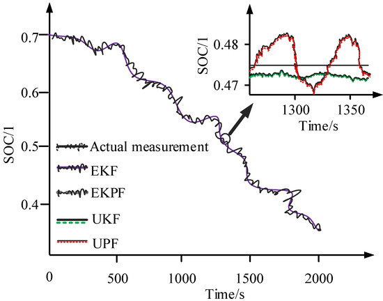 In Figure 8, the overall analysis of RMSE performance comparison results shows that UPF increased by 50.9% compared to EKF, 33.4% compared to EKPF, and 19.6% compared to the UKF. The maximum absolute error was also controlled from around 3% of the EKF to within 1%, but it was relatively slow in running time. However, due to the continuous operation time of the system, it will not possess an essential influence on the actual SOC EEF. The robustness verification of the UPF algorithm is shown in Figure 9.