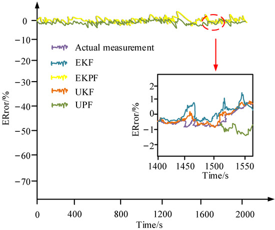 In Figure 9, the CSPs of UPF and EKPF were the fastest; however, the error of UPF was below that of EKPF, and the convergence effect (CEF) was more stable. Moreover, the RMSE of UPF was the smallest, and it demonstrates that the CSP of UKF was slower. Therefore, relative to the other three algorithms, UPF possesses stronger robustness and interference suppression capability. The initial SOC value was 0.2, and the algorithm estimation error is shown in Figure 10.