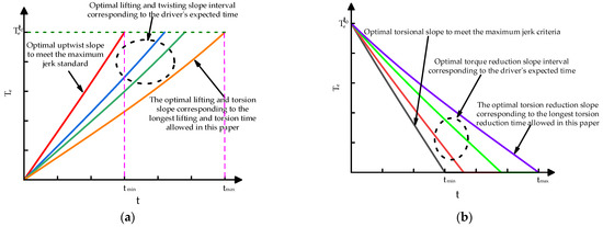 There are two boundary conditions for the designed lifting torsional rate: one is the fastest lifting and twisting rate, which means that the lifting and twisting rate should not exceed the rate corresponding to the maximum impact standard adopted in this article; the other is the slowest lifting and twisting rate, which means that the lifting and twisting rate should not be less than the rate corresponding to the maximum lifting and twisting time allowed in this article. The corresponding lifting and twisting rate based on the driver’s expected lifting and twisting time should change between them, as shown in Figure 3.