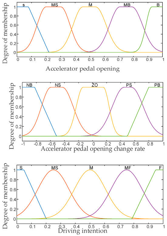In this paper, the accelerator pedal opening and its change rate are selected to reflect the driver’s expectation. According to the driver’s operation of the accelerator pedal, the driver’s intention is divided into sudden deceleration, general deceleration, cruise, general acceleration, and sudden acceleration, which correspond to slow gear shifting, medium-slow gear shifting, medium-speed gear shifting, medium-fast gear shifting, and fast gear shifting respectively. The membership function of the input and output variables of the fuzzy controller is shown in Figure 4.