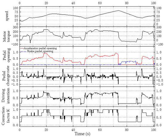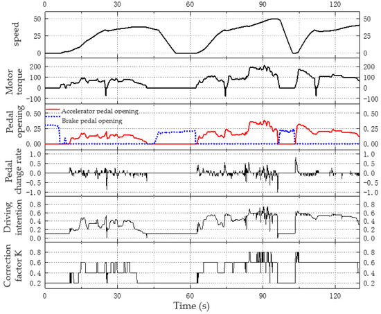 In urban areas, vehicles mainly operate at low and medium speed, and the fluctuation of accelerator pedal opening and its rate of change fluctuate slightly and remain at a relatively low level. After identification by the off-line table of driving intention identification and the time correction factor table, it is recognized that the driving intention is mainly shifting at slow, medium slow and medium speed, with a time correction factor k of 0.2–0.6.