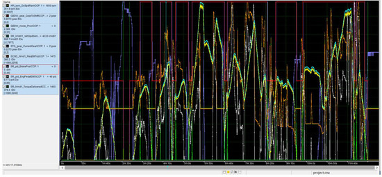 Under the same road conditions, several sets of shift curves with different accelerator pedal opening and its change rate were tested, and the required data of the whole vehicle were calibrated by CANape(12.0), as shown in Figure 10.