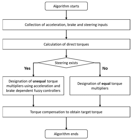 Before delving into the details of this work, it is essential to note that the current literature documents a range of control methodologies for hybrid systems. In terms of dual independent motor-driven tracked electric vehicles, Zhang et al. studied an improved steering control utilizing a model predictive control approach, leading to efficient adherence to specified speed and turn rates []. Their research demonstrates the potential to enhance vehicle stability under varied driving conditions through an intelligent application of predictive control algorithms. Zeyu et al. implemented a neural network combined with a PID algorithm to refine the vehicle’s steering control []. Even though the traction motor torques are initially defined by the neural network, the introduction of PID adjustments accommodates variable terrain coefficients. Hu et al. discussed a dual-motor drive strategy that inherently computes torques for a predetermined target turning radius, employing a PID controller to achieve the radius more rapidly []. Additionally, Pei et al. proposed a torque fuzzy compensation control strategy to enhance steering execution, where torque distribution is regulated by applying direct multipliers derived from fuzzy logic []. Summary of the corresponding study is presented in Figure 2.