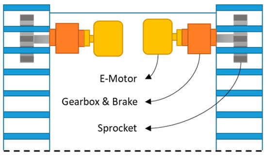 The electric traction system, which is presented in a simplified schematic in Figure 4, is modeled through a composite approach that brings together electric motors, gearboxes, and friction brakes connected to left and right sprockets. This configuration is carefully constructed to accurately reflect the system’s mechanical and electrical interactions, ensuring that the model provides a realistic representation of vehicle dynamics.