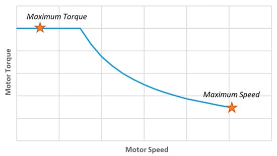 In Equation (1); Tout,Motor, Tavail,Motor (w), and TRequest represent motor torque output, speed-dependent available motor torque, and requested torque via mobility control system, respectively. Speed-dependent available motor torque is obtained from the full load curve, which represents the speed–torque characteristics of the electric motor. Even though the full load curve is distinct in electric motors, it displays a standard trend: a constant torque at lower speeds transitioning to a constant power at higher speeds. This pattern is elaborated on in Aiso’s research [], as exemplified in Figure 5.