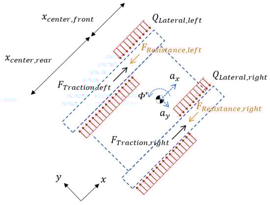 In the above expressions, the terms mVhc, IVhc,zz, ax, ay, and Φ′ denote the mass of the vehicle, inertia about the vertical axis at the vehicle’s center of gravity, accelerations in the longitudinal and lateral directions, and the rate of yaw, respectively. The forces FTraction,left, FTraction,right, FResistance,left, and FResistance,right are indicative of the traction and longitudinal resistance forces acting on the vehicle for left and right tracks, respectively. While QLateral,left and QLateral,right characterize distributed side frictional forces per length interacting with the left and right tracks, lateral distance between the vehicle’s cog (center of gravity) and the vehicle’s front and rear end are denoted by xcenter,front and xcenter,rear. Furthermore, the net forces along the longitudinal and lateral axes are given by ΣFx,i and ΣFy,i, with the corresponding distances from these net forces to the vehicle’s center of gravity being represented by xResultant and yResultant, correspondingly.