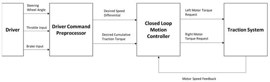 Based on the research and findings presented in previous sections, it is found that the vehicle in question, a high-speed off-road military vehicle, requires a strong and effective closed-loop control system to achieve the targeted maneuverability at high speeds across various terrains. It has been determined that while producing overall torque in response to the driver’s input is correlated with the accelerator pedal’s position, the distribution of torque should be adjusted based on feedback from the speed difference between the sprockets. This differential is related to the angle of the steering wheel set by the driver. In other words, a certain speed differential between the electric motors is decided, corresponding to the given steering wheel angle, through the employment of the closed-loop controller. The strategy for mobility control can be seen in Figure 7, demonstrated via block diagrams. There are four primary subsystems, each with special roles. The Driver block is designed to feed specific driver commands for varying test runs and is separate from the onboard vehicle control system. The Driver command preprocessor and the closed-loop controller blocks are critical to the control system, handling the computational side of mobility control and transforming driver instructions into specific torque demands for the left and right motors. Lastly, the traction system represents the plant, including mathematical models of the electric motor and gearbox. The outputs from the traction system are the torques delivered to the left and right sprockets, which are the main inputs of the vehicle’s dynamic model.