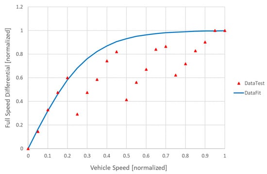 The steering shaping function aims to transform steering commands into differences in motor velocities through a suitable shaping strategy. FNSS Savunma Sistemleri A.Ş., operating out of its Ankara, Turkey location, has compiled test records from standard tracked vehicles for calibration purposes. Upon analyzing the change in speed at maximum steering, a pattern is noted where the difference in speed across the motors at full steer changes with vehicle velocity. However, this increase is interrupted by sudden changes at certain velocities, making the pattern non-linear. A closer inspection shows that these dips coincide with the gear shifting points of traditional gearboxes. For consistent steering behavior, a smooth curve is mapped over the test data, excluding these dips. The normalized version of these test data together with the smoothing curve is depicted in Figure 8, ensuring confidentiality.