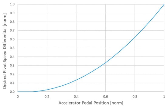 The pivot maneuver is executed through a specifically designed shaping function. Initially, the maximum speed range is established. Subsequently, the position of the accelerator pedal is correlated to this range to achieve the required speed differential. In addition, the angle of the steering wheel is utilized to decide the pivot turn’s direction, allowing the driver to command a counterclockwise (CCW) or clockwise (CW) rotation by steering, regardless of the actual degree of the wheel’s turn. The plot for this pivot shaping strategy can be found in Figure 9, providing a visual representation of the maneuvering process.