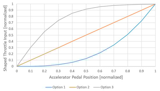 In scenarios where safety is significant, such as in the preliminary testing phase of the algorithm, a conservative throttle response is preferred. This scenario is optimally supported by a shaping function like option 1 in Figure 10, which is characterized by a more gradual and controlled acceleration curve. On the other hand, for circumstances that demand a more robust and dynamic performance, such as during an aggressive driving test, the shaping curve should approach option 3 in Figure 10. This latter option is fine-tuned to yield a sharper and more immediate increase in throttle response, reflecting the vehicle’s need for rapid acceleration. Throughout many testing protocols and simulation exercises, option 2, which represents linear throttle shaping, is the preferred choice. This option is beneficial because it provides a straightforward correlation between pedal input and throttle output. Such predictability enables the control engineer to isolate and evaluate the performance characteristics of each subsystem without the added complexity that non-linear shaping options might introduce.