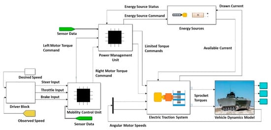 In this section, attention is given to the modeling process for the plant of the hybrid electric tracked vehicle. The focus is on the representation of hybrid electric propulsion systems specific to tracked vehicles and on modeling techniques that capture the dynamic relationships between the traction system’s components and the vehicle’s overall architecture. Furthermore, power sources are briefly defined, even though the scope of this work is powertrain and mobility of the vehicle rather than energy management.