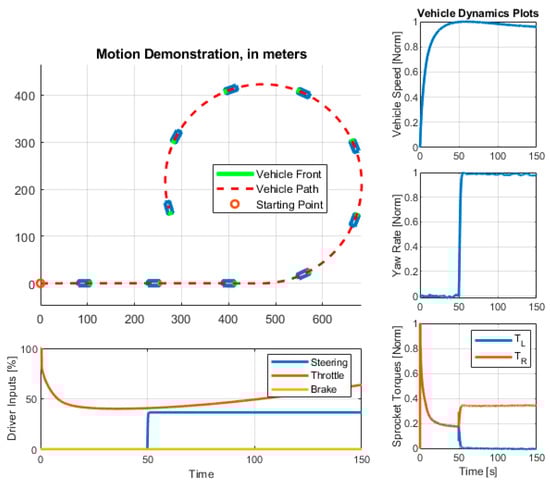 An example of this simulation platform can be seen in Figure 12, which specifically illustrates the interface during a scenario involving a forward steering motion at a predetermined longitudinal speed of the vehicle. In this simulation, it is observed that upon reaching the 50th second of the simulation time, the driver introduces a steering command, inputting a 40% steering angle into the system. Due to this action, the motor torques experience a substantial and rapid increase. After this initial jump in torque caused by the need to adjust the vehicle’s trajectory according to the steering input, the motor’s torque levels exhibit a stabilization, converging to a steady-state value. The steady-state torques involved in steering are now balanced, and the vehicle maintains the new desired directional path at a constant speed.