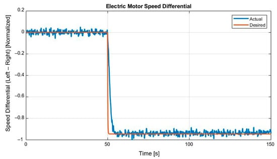 Additionally, Figure 13 indicates that the speed differential between the left and right electric motors reaches the preset target specified by the steering shaping function. An upward trajectory in speed difference is observed as the steering input rises, a response predicted from the closed-loop control system. The presence of noise in the actual speed differential originates from the characteristics of the electric motors’ encoders. It is assumed that the encoders are influenced by white noise to test the controller’s capability to cope with this type of disturbance.