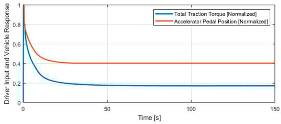 Observations of the vehicle’s longitudinal response are demonstrated in Figure 14 as well. It is noted that there is a proportional increase in the vehicle’s total torque, correlating with the rise in the accelerator pedal position, regardless of the steering input. This effect is achieved by applying a linear throttle shaping function, as explained in the mobility control system section.
