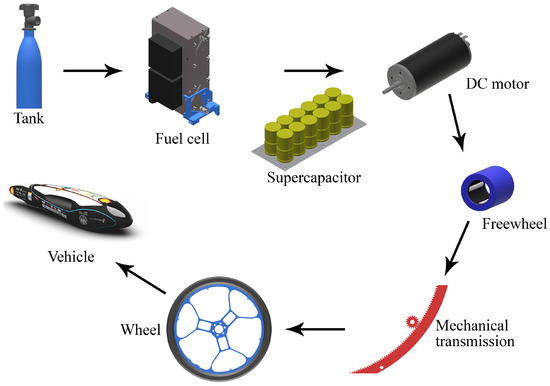 The FC uses the hydrogen stored in the tank to produce electrical energy. The generated power can be used to supply the EM or to recharge the SC. Torque is applied to the vehicle’s rear drive wheel by a suitable mechanical transmission. In addition, a freewheel is inserted between the electric motor’s shaft and the mechanical transmission to decouple the system when the vehicle is free-rolling.