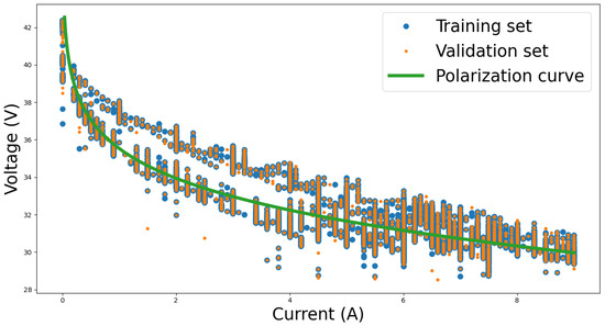 As shown in Figure 3, the data collected during the on-bench test were divided into two sets, with first used to estimate the unknown parameters and the second to validate the proposed model. The resulting polarization curve accurately characterizes the FC behavior and agrees well with the validation dataset, confirming the reliability of the model in simulating system responses.