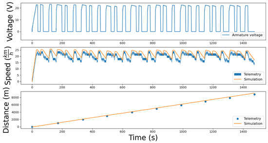 The vehicle’s dynamic parameters were gathered instead from a variety of sources: CFD simulation, wind tunnel testing, CAD analysis, and direct measurement. The resulting model was validated by comparing the simulation results with data collected on the track by an onboard data logger. In particular, the measured armature motor voltage was used as model input and vehicle speed and traveled distance were compared. Figure 4 highlights the model’s ability to describe the on-track data.