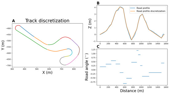 (A) Discretization of the track into sectors. (B) Elevation and discretization of the road profile. (C) Road gradient of each sector.